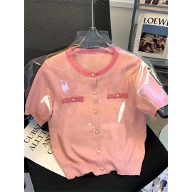 Solid Crew Neck T-shirt, Elegant Short Sleeve Ruched Top For Spring & Summer, Women's Clothing